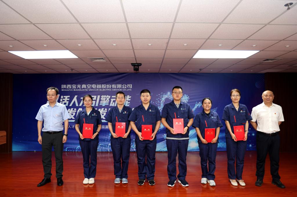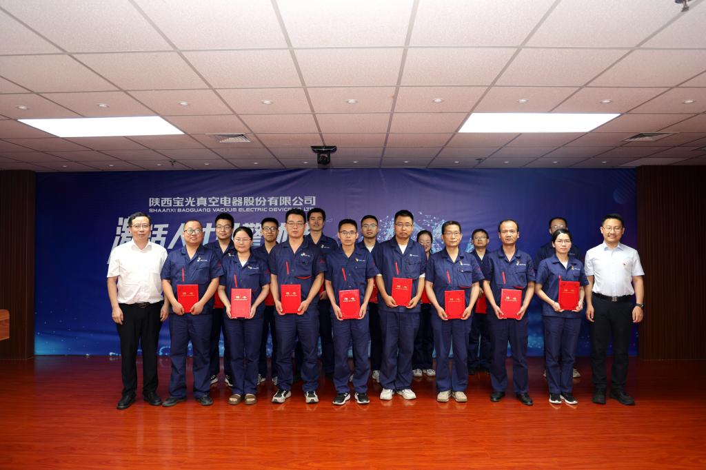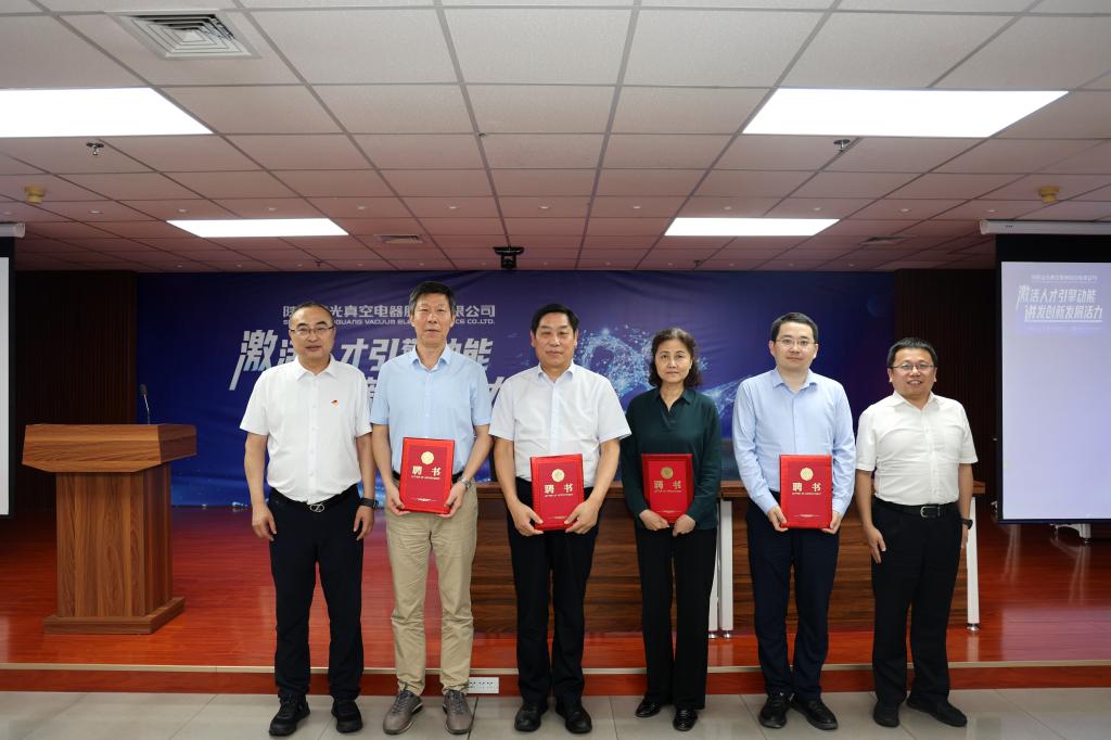寶光股份紀委書記姚書勤,副總經理袁軍為分別宣讀了高層次科技創新人才和重大創新團隊名單。謝洪濤為元復興、劉志遠、顏莉萍、馬慧4名外部專家頒發了聘書,組織簽訂了內外部師帶徒協議。向高層次科技創新人才頒發了聘書,并與重大創新團隊負責人簽訂了定向支持承諾書,首批選取了變壓器有載分接開關真空滅弧室研發、252kV單斷口真空滅弧室研發、高電壓真空滅弧室研發、高可靠彈性元件研究四個項目做為重大創新項目進行專項激勵,與項目帶頭人簽訂了激勵任務書。外部專家的加入不僅為企業提供了強有力的智力支持,更能通過指導和交流激發企業內在技術研發創新動力,這為高層次科技創新人才培養和重大創新團隊后期工作開展提供了方向引領和堅實技術支持保障。