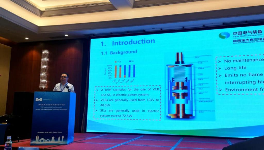 技術中心副主任馮衛剛博士受組委會邀請,向大會做關于真空滅弧室觸頭間隙絕緣強度預測方法的專題報告,介紹了一種采用小型真空滅弧室的絕緣強度,預測大型真空滅弧室絕緣強度的新方法,受到參會專家和行業同仁的認可和好評。