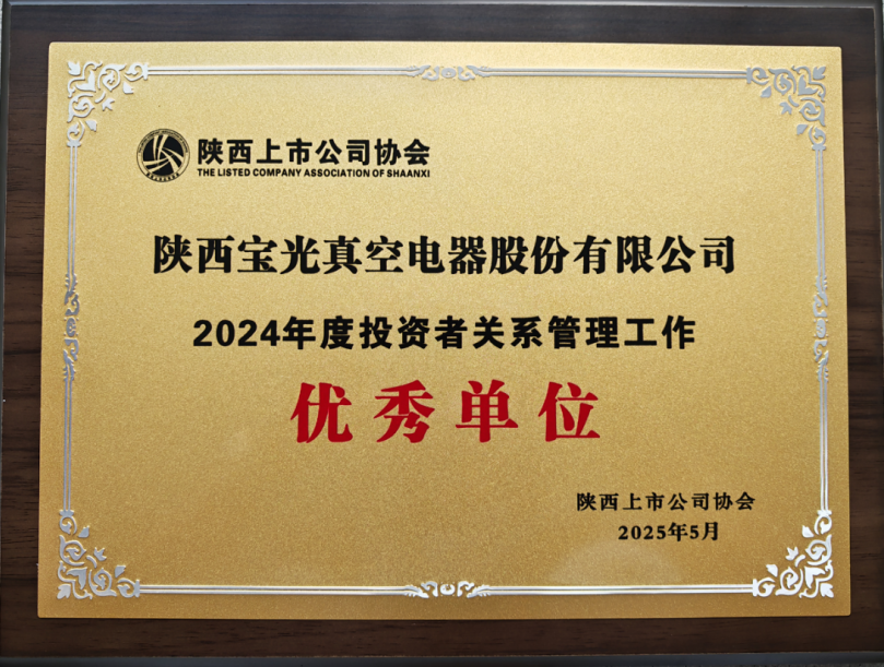 5月15日,陜西上市公司協會與陜西證券期貨業協會聯合發布2024年度評優結果,寶光股份憑借在投資者關系管理領域的卓越實踐,榮獲“2024年度投資者關系管理工作優秀單位”稱號,這是對公司長期以來重視投資者關系管理的高度認可。