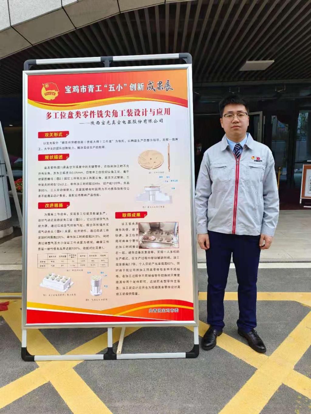 王棟,寶光股份零件產品制造部銑工,一個陽光、快樂而又熱衷創新的90后,4月28日,他所設計的《多工位盤類零件銑尖角工裝設計與應用》項目進入寶雞市“五小創新” 名錄,同時他受邀代表全市青年在寶紀念五四運動102周年暨建團99周年大會期間向與會領導和嘉賓介紹了項目的設計及應用情況,得到與會領導和嘉賓的充分肯定。