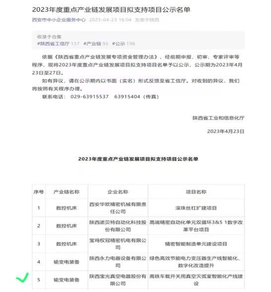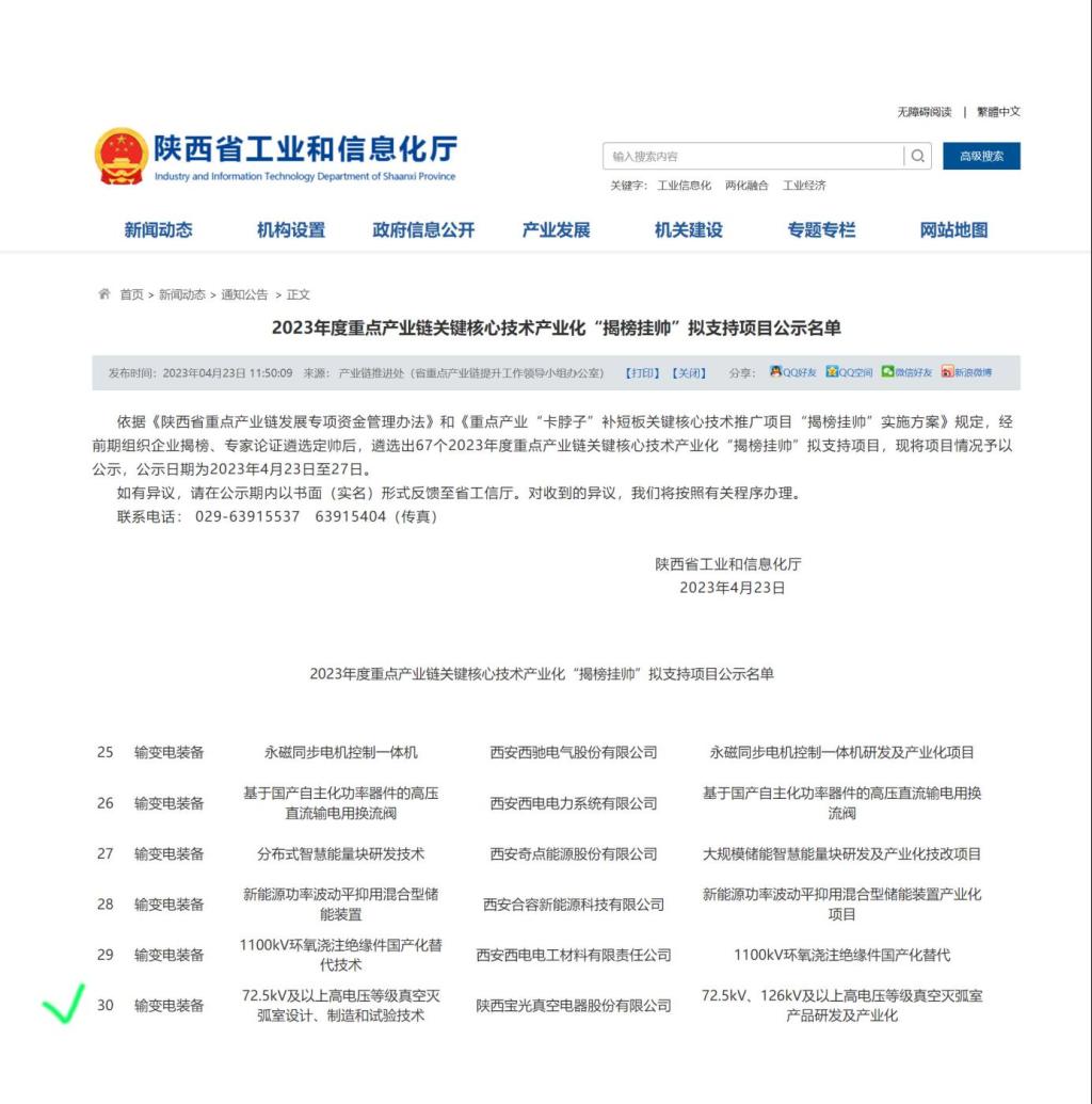 通過認真籌備、資料審核及現(xiàn)場答辯,由公司組織申報的“72.5kV、126kV及以上高電壓等級真空滅弧室產(chǎn)品研發(fā)及產(chǎn)業(yè)化”項目與“高鐵車載開關(guān)用真空滅弧室智能化產(chǎn)線建設(shè)”項目分別中榜陜西省工信廳2023年關(guān)鍵核心技術(shù)產(chǎn)業(yè)化“揭榜掛帥”項目與重點產(chǎn)業(yè)鏈發(fā)展項目,并已進入公示階段。
